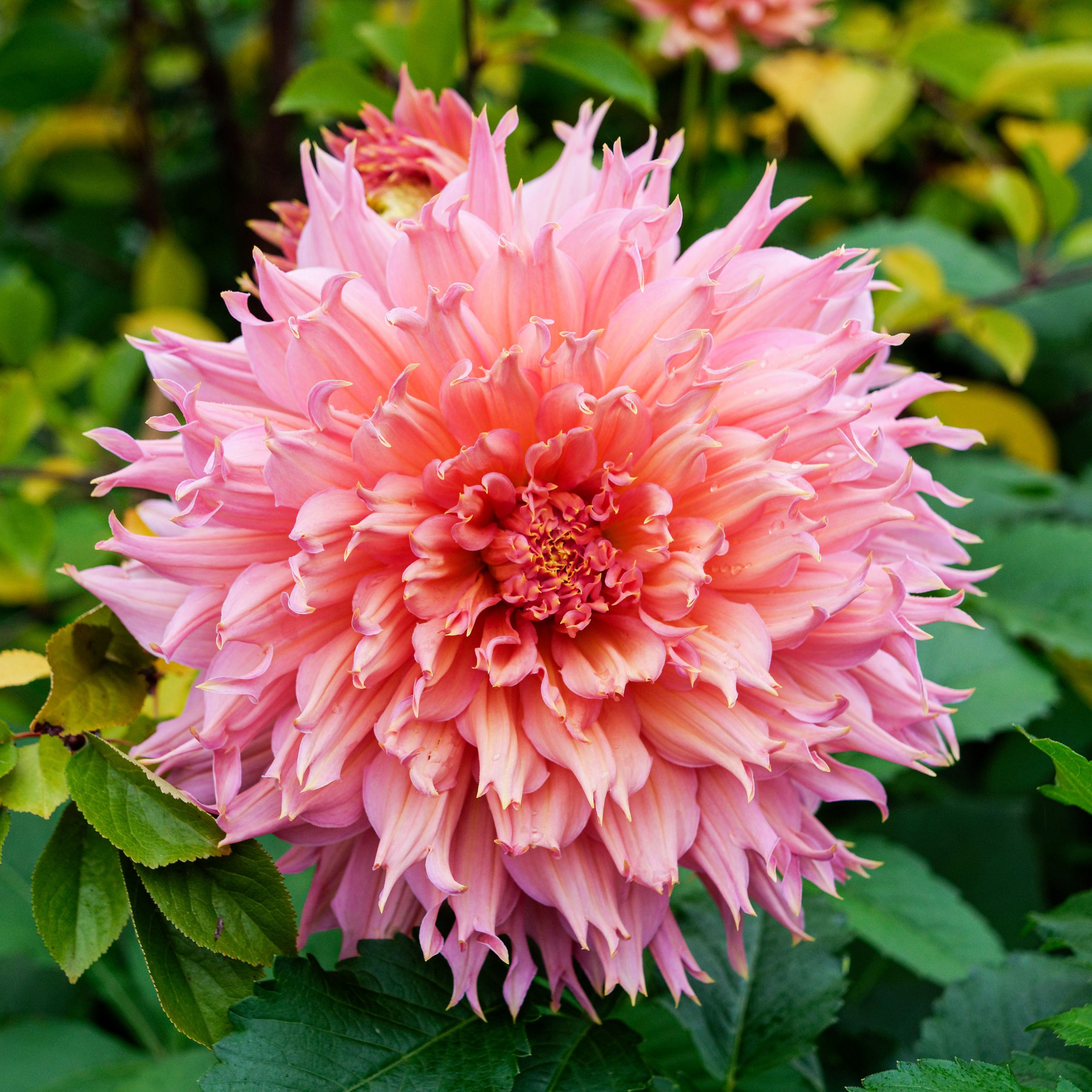 ‘Oméga' est un dahlia dentelle au port compact et aux grandes fleurs couleur saumon-pêche et au coeur jaune chaud. C’est une plante robuste et florifère et un de mes préférées.